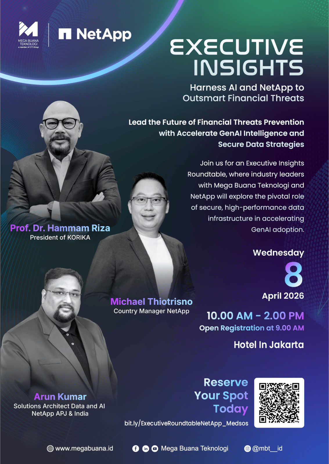 Mega Buana Teknologi (MBT), berkolaborasi dengan NetApp, mengundang Anda untuk menghadiri seminar eksklusif dengan tema "Lead the Future of Financial Threats Prevention with Accelerate Gen AI Intelligence and Secure Data Strategies", yang membahas mengenai peran penting infrastruktur data yang aman dan berkinerja tinggi dalam mempercepat penggunaan, implementasi, dan penerapan teknologi GenAI dalam perusahaan.