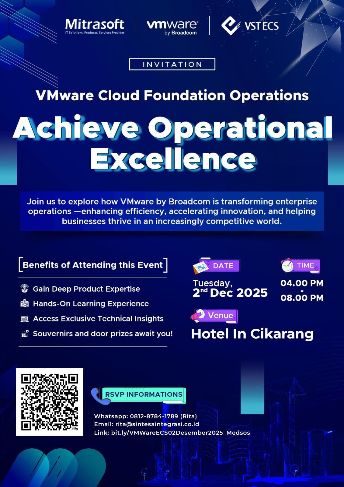 ECS Indo Jaya mengundang Anda untuk membahas mengenai bagaimana VMware by Broadcom menghadirkan transformasi pada operasional enterprise—meningkatkan efisiensi, mempercepat inovasi, serta membantu perusahaan beradaptasi dan berkembang di lingkungan bisnis yang semakin kompetitif.